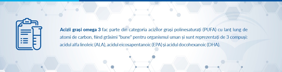 Acizii grasi omega 3 fac parte din categoria acizilor grasi polinesaturati (PUFA) cu lant lung de atomi de carbon, fiind grasimi “bune” pentru organismul uman si sunt reprezentati de 3 compusi: acidul alfa linoleic (ALA), acidul eicosapentanoic (EPA) si acidul docohexanoic (DHA).