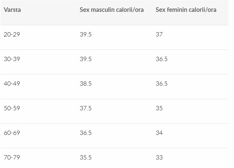 Rata metabolica se calculeaza in conformitate cu apartenenta la sex si varsta a fiecarei persoane, fiind exprimata in numarul de calorii arse pe ora pentru obtinerea energiei necesare pentru functionarea organismului.