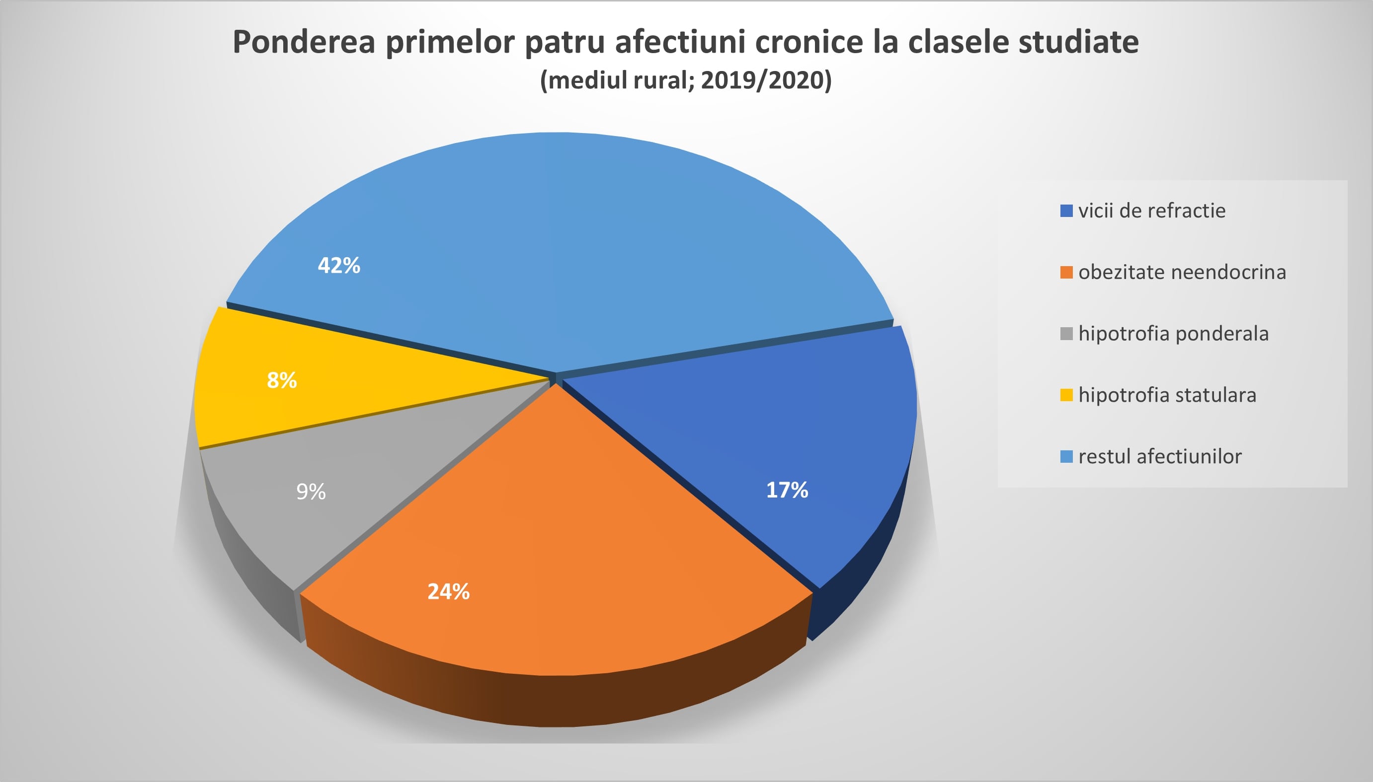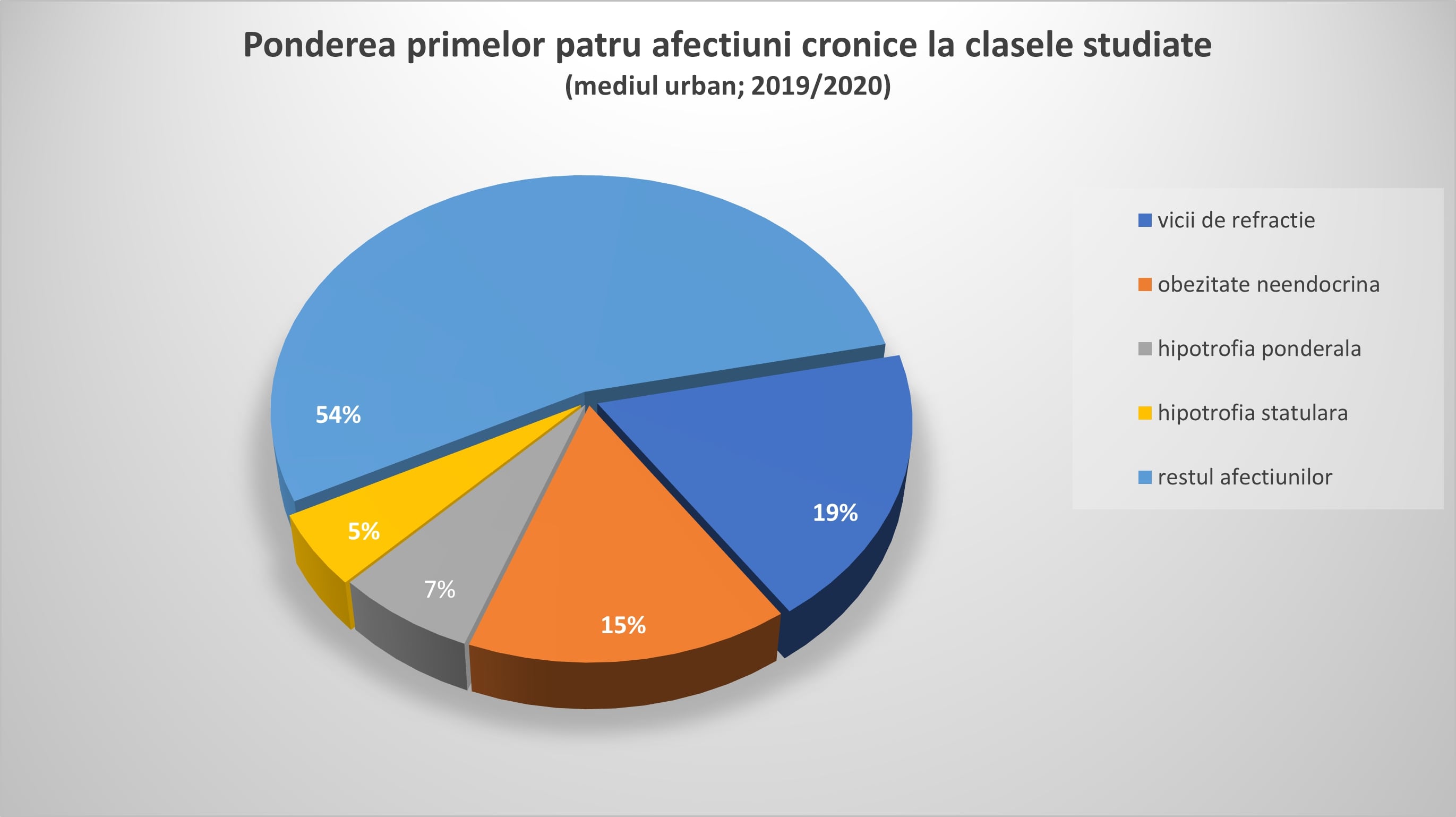 Conform Raportului National de Sanatate a Copiilor si Tinerilor din Romania (2020), obezitatea de cauza neendocrina este pe locul 2 in topul afectiunilor cronice la copii, dupa viciile de refractie (miopie, hipermetropie, astigmatism) si este in continuare pe un trend ascendent de la prescolari pana la clasa a XII‐a, atat in mediul urban cat si in mediul rural.