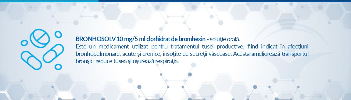 Bronhosolv 10 mg/5 ml solutie orala este un medicament pentru tratamentul tusei productive, fiind indicat in afectiuni bronhopulmonare, acute şi cronice, insotite de secretii vascoase.