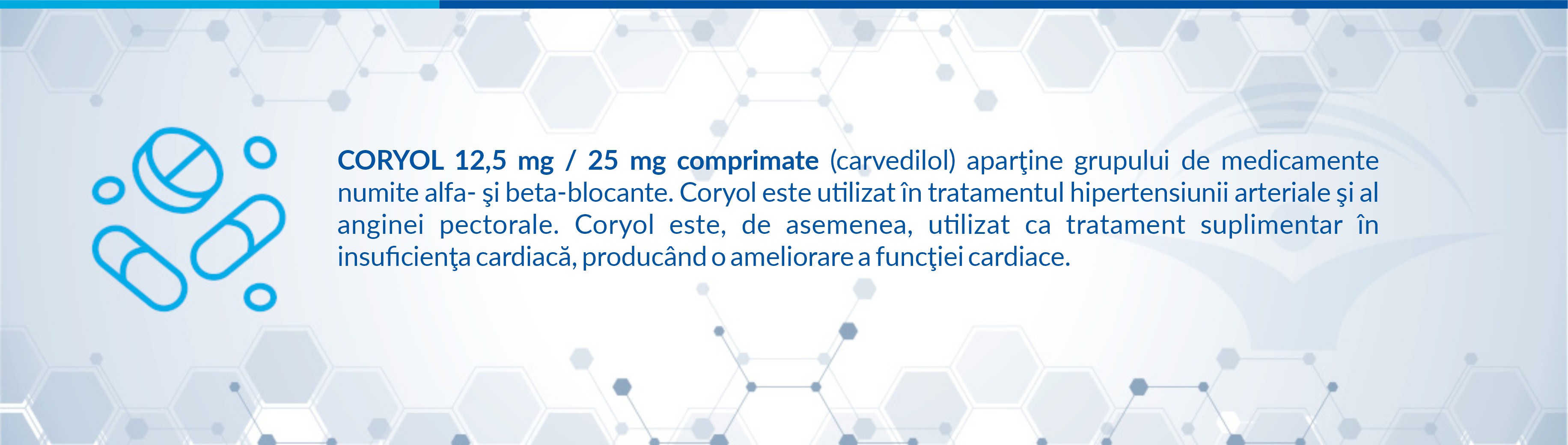 Carvedilol apartine grupului de medicamente numite alfa- şi beta-blocante. Coryol este utilizat in tratamentul hipertensiunii arteriale şi al anginei pectorale. Coryol este, de asemenea, utilizat ca tratament suplimentar in insuficienta cardiaca, producand o ameliorare a functiei cardiace.