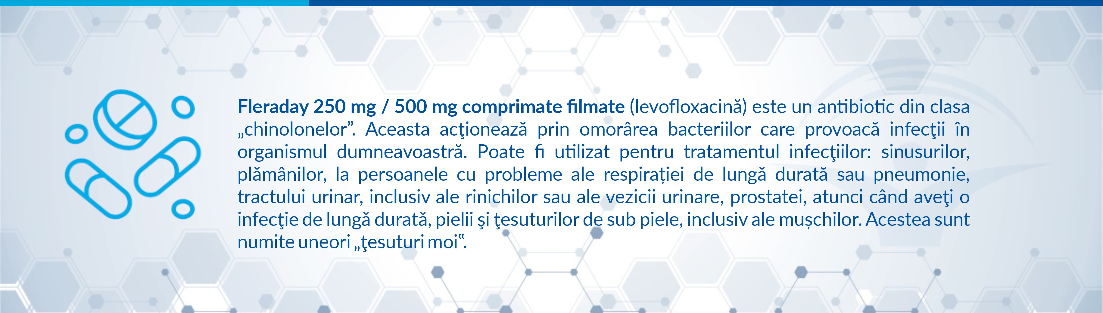 Fiecare comprimat filmat Fleraday 250 mg contine levofloxacina 250 mg (sub forma de levofloxacina hemihidrat).