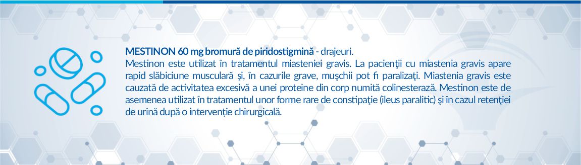 Mestinon este utilizat in tratamentul miasteniei gravis. La pacientii cu miastenia gravis apare rapid slabiciune musculara şi, in cazurile grave, muşchii pot fi paralizati. Miastenia gravis este cauzata de activitatea excesiva a unei proteine din corp numita colinesteraza.