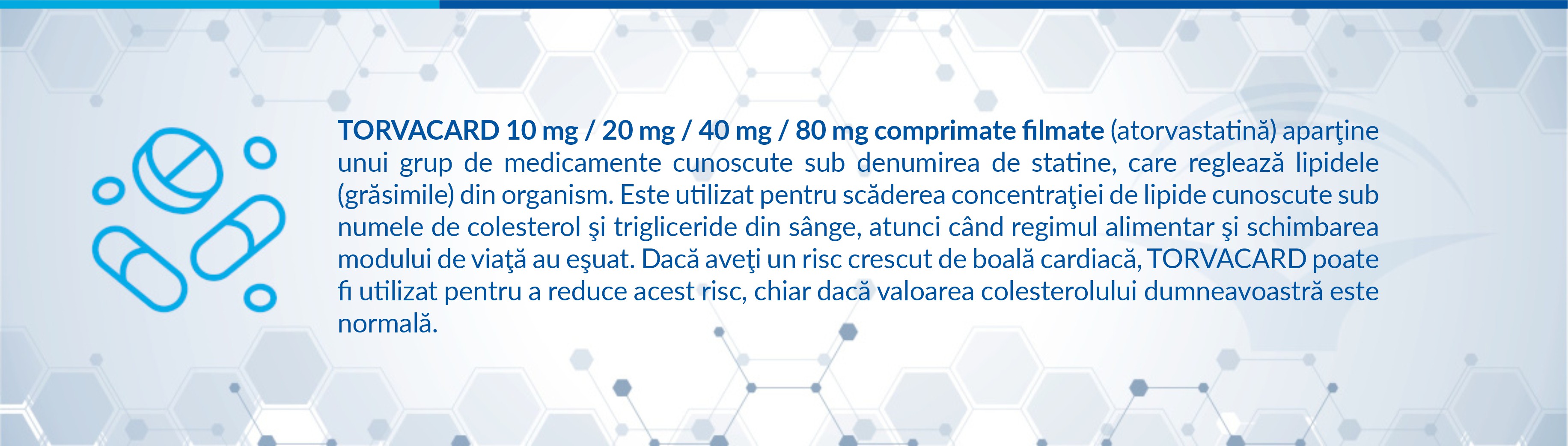 TORVACARD este utilizat pentru scaderea concentratiei de lipide cunoscute sub numele de colesterol şi trigliceride din sange, atunci cand regimul alimentar şi schimbarea modului de viata au eşuat. Daca aveti un risc crescut de boala cardiaca, TORVACARD poate fi utilizat pentru a reduce acest risc, chiar daca valoarea colesterolului dumneavoastra este normala. In timpul tratamentului trebuie continuat un regim alimentar standard de reducere a colesterolului.