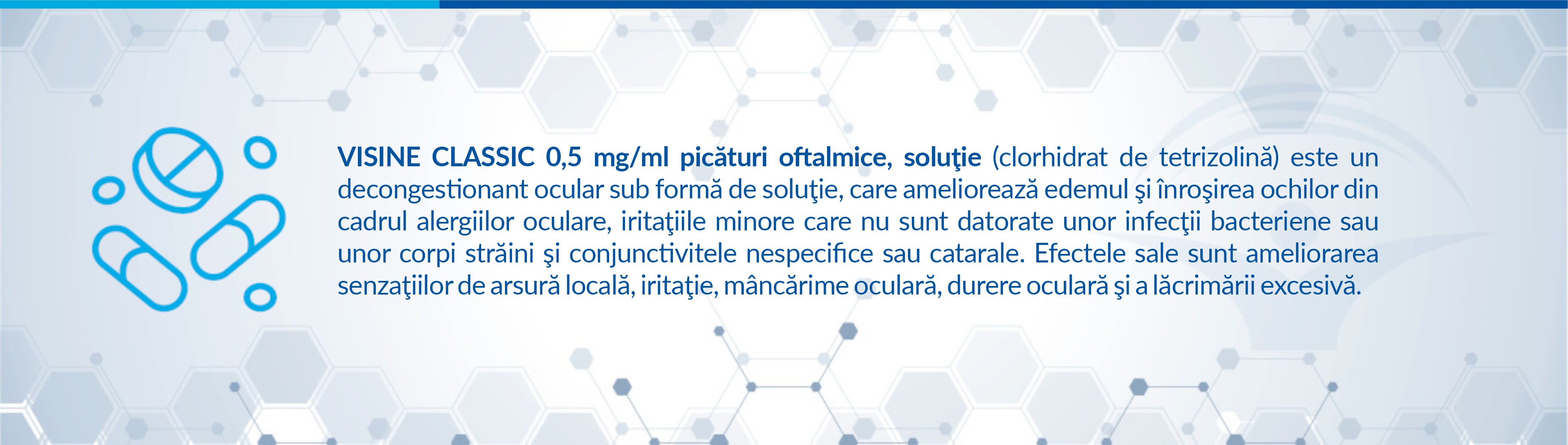 Visine Classic este un decongestionant ocular sub forma de solutie, care amelioreaza edemul şi inroşirea ochilor din cadrul alergiilor oculare, iritatiile minore care nu sunt datorate unor infectii bacteriene sau unor corpi straini şi conjunctivitele nespecifice sau catarale. Efectele sale sunt ameliorarea senzatiilor de arsura locala, iritatie, mancarime oculara, durere oculara şi a lacrimarii excesiva.